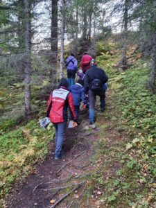 Oppmarsj. Turen tok ca 20 minutter fra parkering. Turen var lagt opp som ei orienteringsløype der mål var ved Litjevatnet.