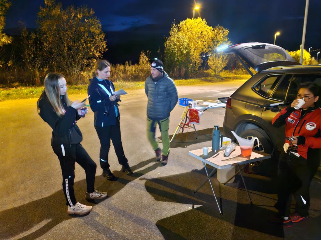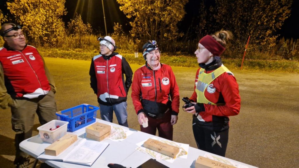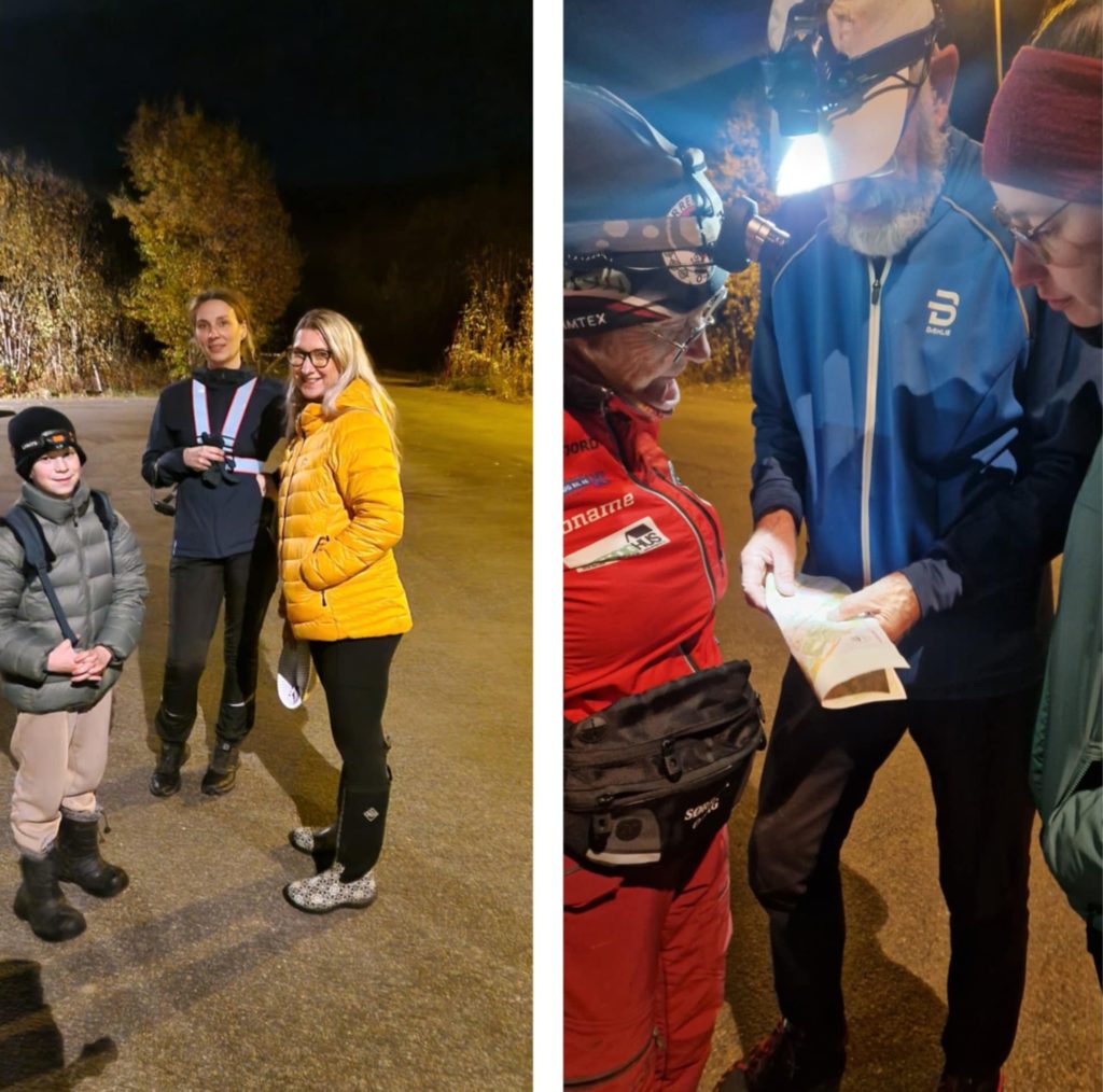 Bildet til venstre: Kristian Bjørnslett (t.v.) og Kristina Ilceinkaite (t.h.) ville kjenne på nattorienteringens gleder og gjennomførte N-/C-løypa. Inga Tamosaityte i midten. Bildet til høyre: Eli Blomseth Helgesen (t.v.) hører på når ektemann Ivar Helgesen forteller når han så lyset mens Stine-Mari Gabrielsen følger med.