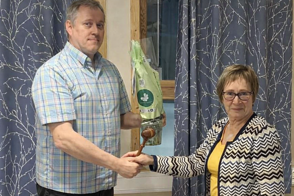 Jon Helge Vaeng får blomster fra nyvalgt leder Eli Blomseth Helgesen og gir henne lederklubben i retur. (Foto: Rune Harald Hansen).