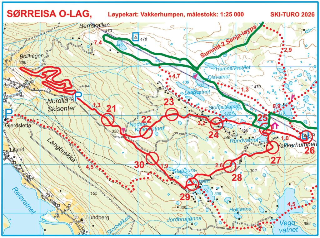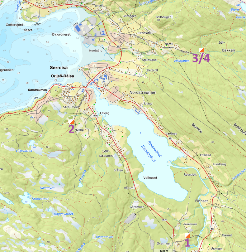 På kartet har vi markert anbefalt startsted for hver tur. 1. Nermoen/Vollen: Finnset grendehus. 2. Sørsia/Heia: P-plass ved Sørreisa stadion. 3/4. Valnesrunden og Vakkerhumpen: P-plass ved Nordliveiens ende.